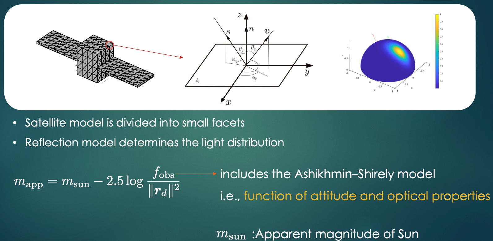 This research developed a new navigation technique for approaching malfunctioning satellites and debris in space. Conventional methods can only determine the "direction (azimuth and elevation angles)" from camera images, but face the problem of not being able to accurately measure the crucial "distance." This is similar to looking up at stars in the sky—you can tell which direction they are in, but it's difficult to know how far away they are. To solve this problem, this research added "light curve (brightness variation)" information. Target objects reflect sunlight, and their brightness changes depending on the distance. Brightness also varies due to rotation. By combining this brightness information with directional information, numerical simulations confirmed that distance estimation accuracy significantly improved. However, when simultaneously estimating orbit and attitude, the improvement effect was limited, revealing the need to devise the estimation sequence in future work. This technology can be applied to future space debris removal missions and other applications.