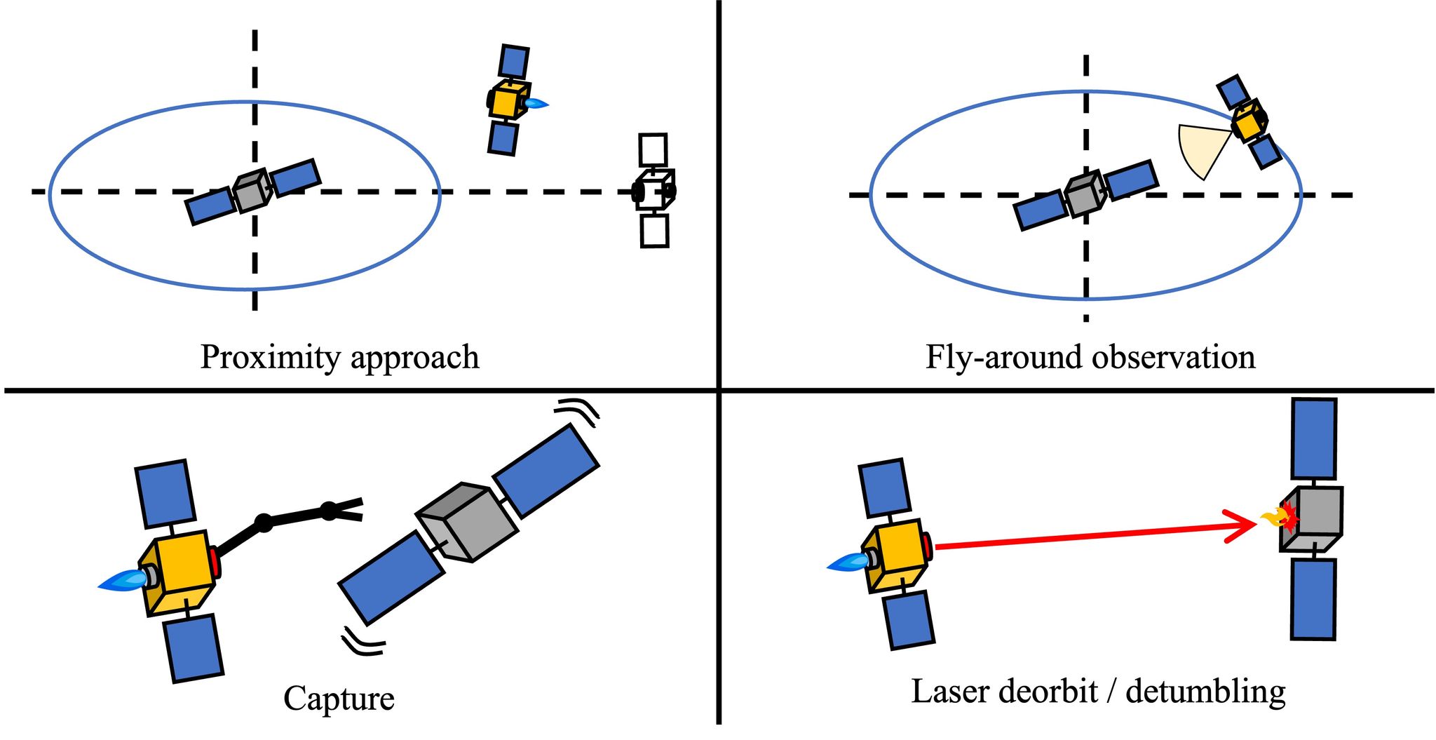レーザ搭載衛星によるスペースデブリ除去を想定した相対軌道設計の研究に取り組んでいます.軌道上でレーザ搭載衛星がスペースデブリへレーザパルスを照射し,アブレーション推力を発生させスペースデブリの軌道を降下させます.この際,スペースデブリがレーザ搭載衛星から離れてしまうため,レーザ搭載衛星は電気推進による推力を用いて追従し,レーザ照射が可能な相対軌道を維持する制御が必要となります.そのため,Isobeらは相対軌道要素(Relative Orbital Elements, ROE)を用いた相対軌道制御手法を提案しました.